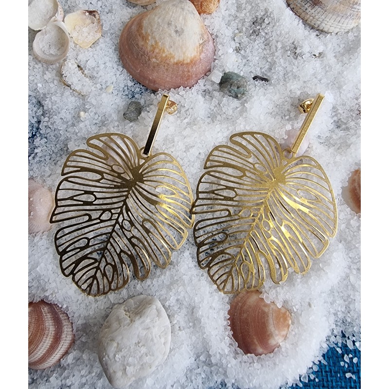Paire de boucles d'oreille en forme de grande feuille doré montée sur clous en acier inoxydable.