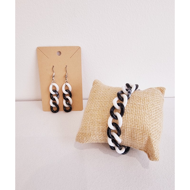 Voici la parure Arinella (bracelet et paire de boucle d'oreille) en petites mailles acryliques déclinée en plusieurs couleurs combinées.