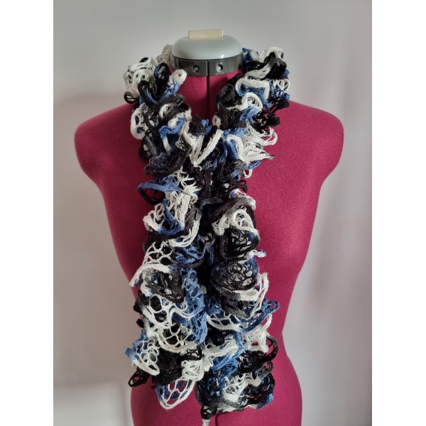 L'écharpe 3 couleurs (noir, blanc, bleu) est un modèle unique fait à la main !